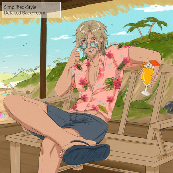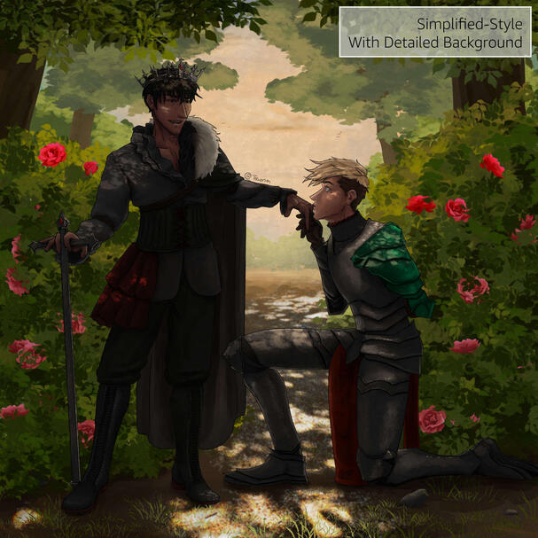 Simplified-style : $80With added detailed* background : +$30THREE (3) or more people in request : +$20 per person.This style has more flat colors and simplified shading. It focuses less on being realistic compared to the Detailed-style.