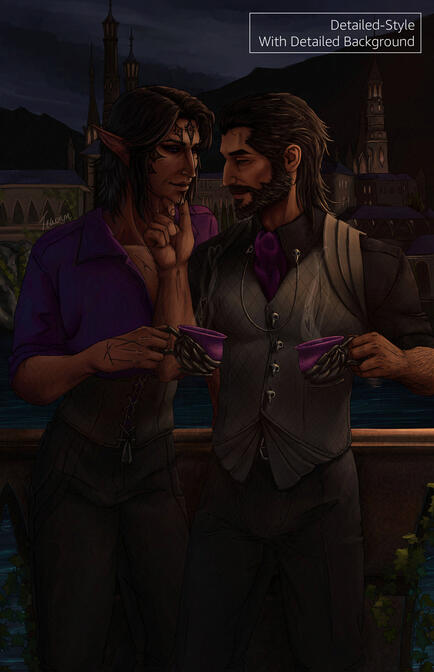 Detailed-style : $130With added detailed* background : + $30TWO (2) or more people in request : +$20 per additional person.Detailed-style aims to achieve a more realistic look compared to the other styles (such as with shading and physical features).
